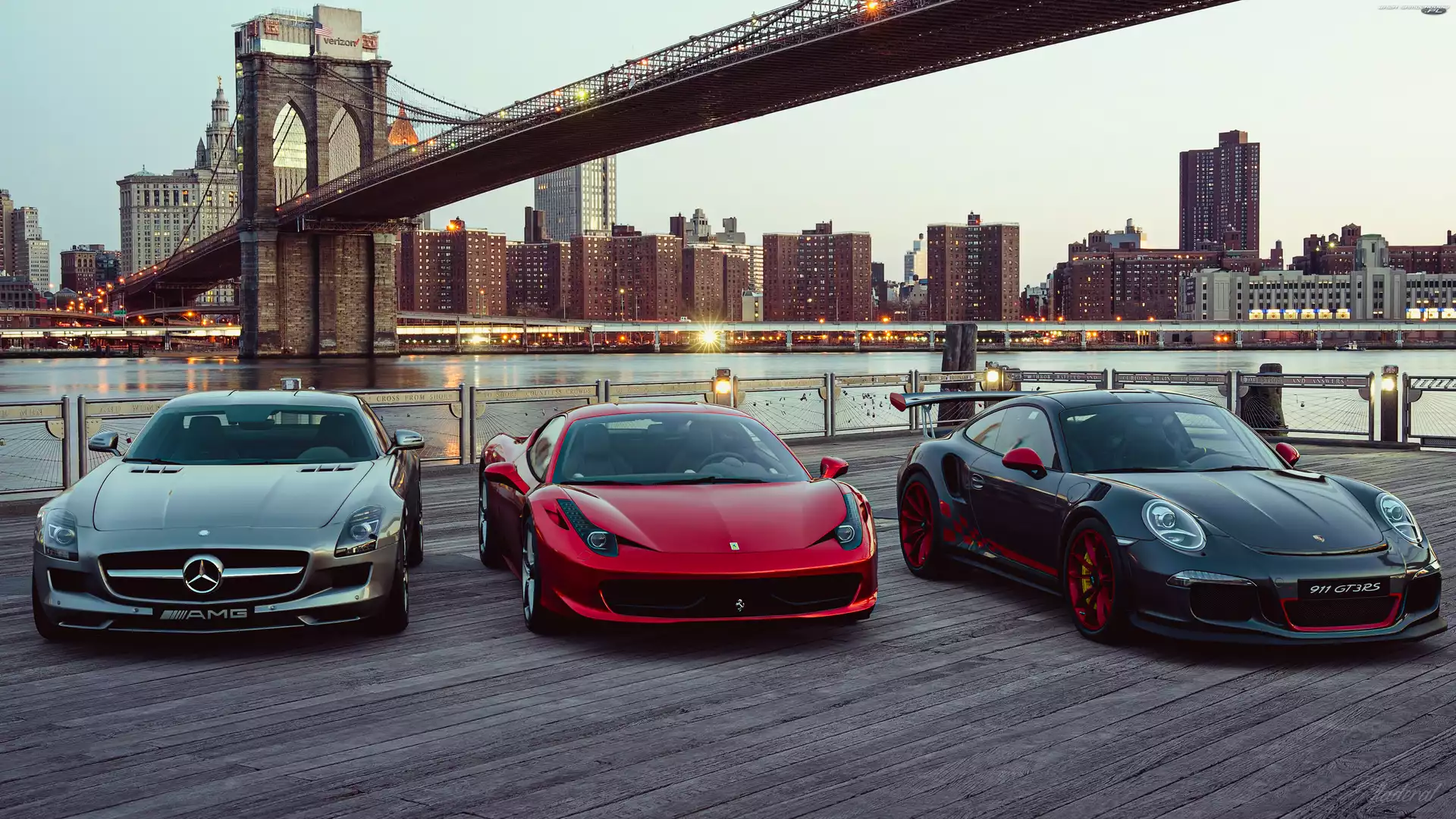 Porsche 911 GT3 RS, Trzy, Nowy Jork, Mercedes-AMG SLS, Ferrari, Most Brookliński, Samochody- Zdjęcia samochodów
